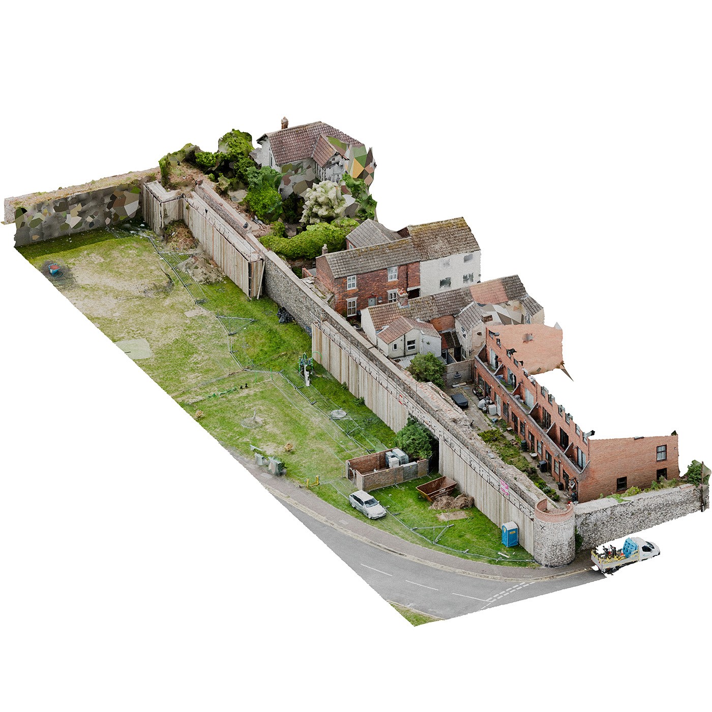 For this commission, a drone survey was carried out to capture high-resolution imagery of the wall’s upper sections, areas that are difficult or unsafe to inspect from the ground. The aerial data was processed into a detailed 3D photogrammetric model, which provided the basis for a set of scaled elevations used directly by conservation teams on site. These drawings supported precise condition annotations, accurate area measurements, and reliable record-keeping for the repairs.