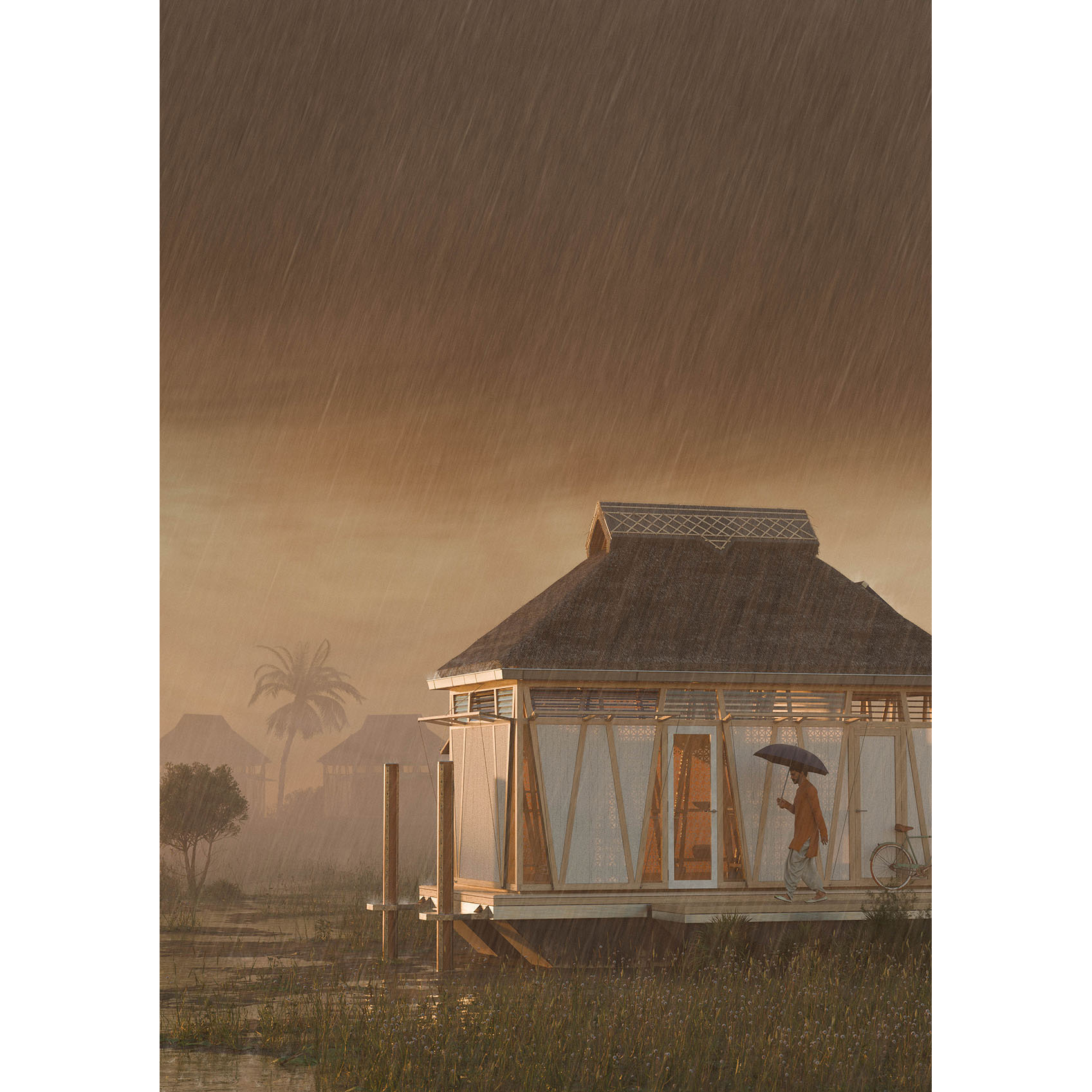 Monsoon Pontoon was my entry to the Kingspan Microhome competition, developed around the brief for a compact, 25m² off-grid dwelling. Since the competition didn’t prescribe a site, I expanded the brief with my own guiding interests. The aim was to identify a situation where the microhome typology could serve as a genuine intervention, rather than a prefabricated solution in search of a problem. This led me to explore how such a model might respond to the realities of life in flood-prone regions like Bangladesh, where communities face the threat of seasonal flood-related displacement.